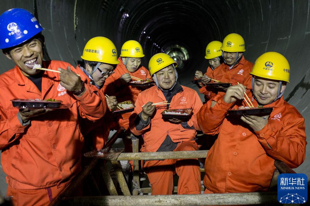 2014年1月30日農歷除夕,為確保工程按計劃順利完工,中鐵隧道集團承建的北京市南水北調配套工程東干渠第五標段仍在施工,工人們在自己的工作崗位上吃了頓特殊的年夜飯。新華社記者 張宇 攝