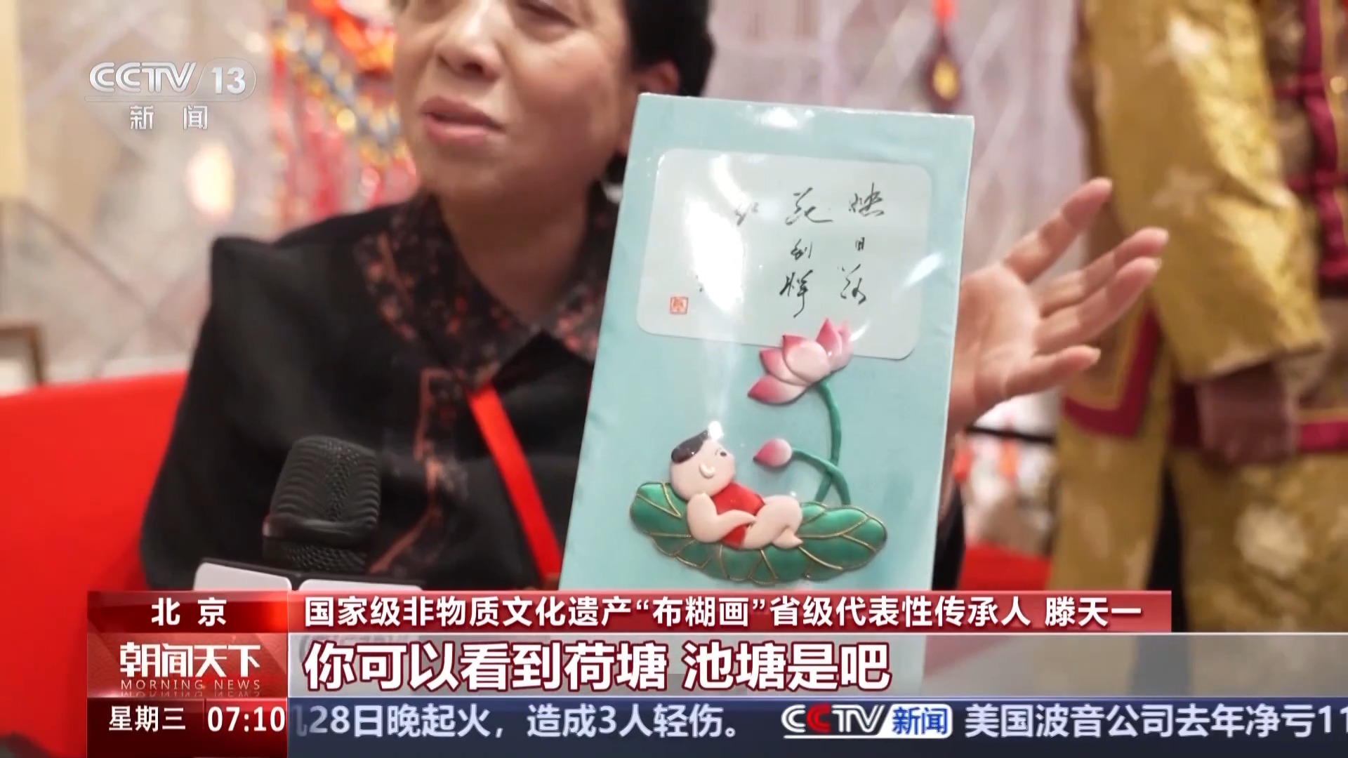 北京國家級非物質文化遺產“布糊畫”省級代表性傳承人 滕天一:很多手工掛件做完了到不了一分鐘就買走了。從古到今幾千年了,我們中國的東西到哪兒你細看,它是有內涵的東西。比如說我拿了楊萬里的一句詩“映日荷花別樣紅”你可以看到荷塘、池塘是吧,再想到我們的詩、詩人,它都是有意境的。