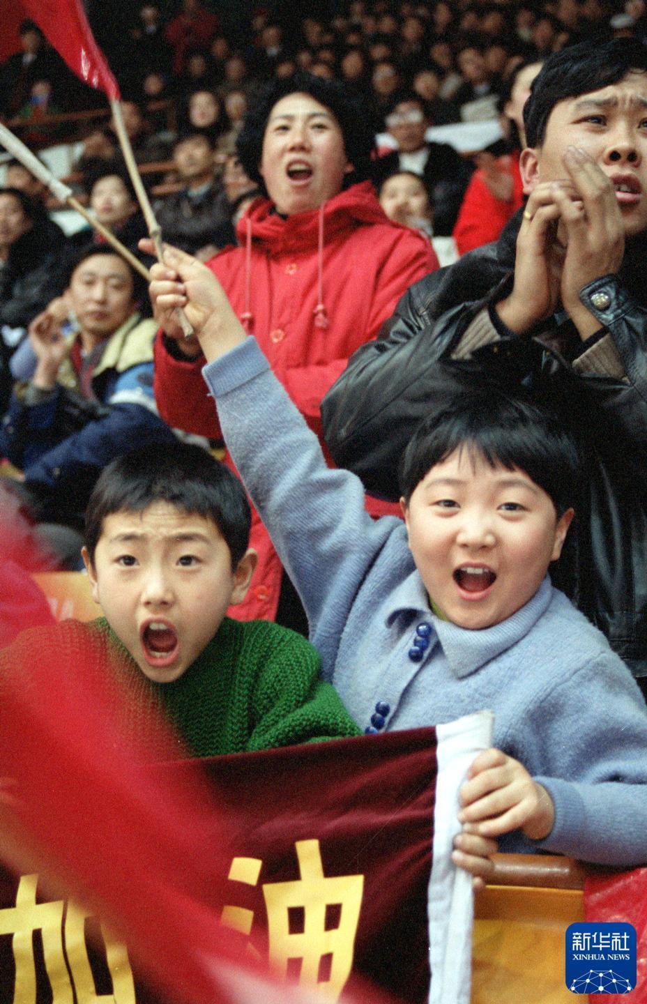 1996年2月6日,在第三屆亞冬會女子短道速滑3000米接力賽中,觀眾搖旗吶喊,為參賽選手加油。新華社記者 官天一 攝