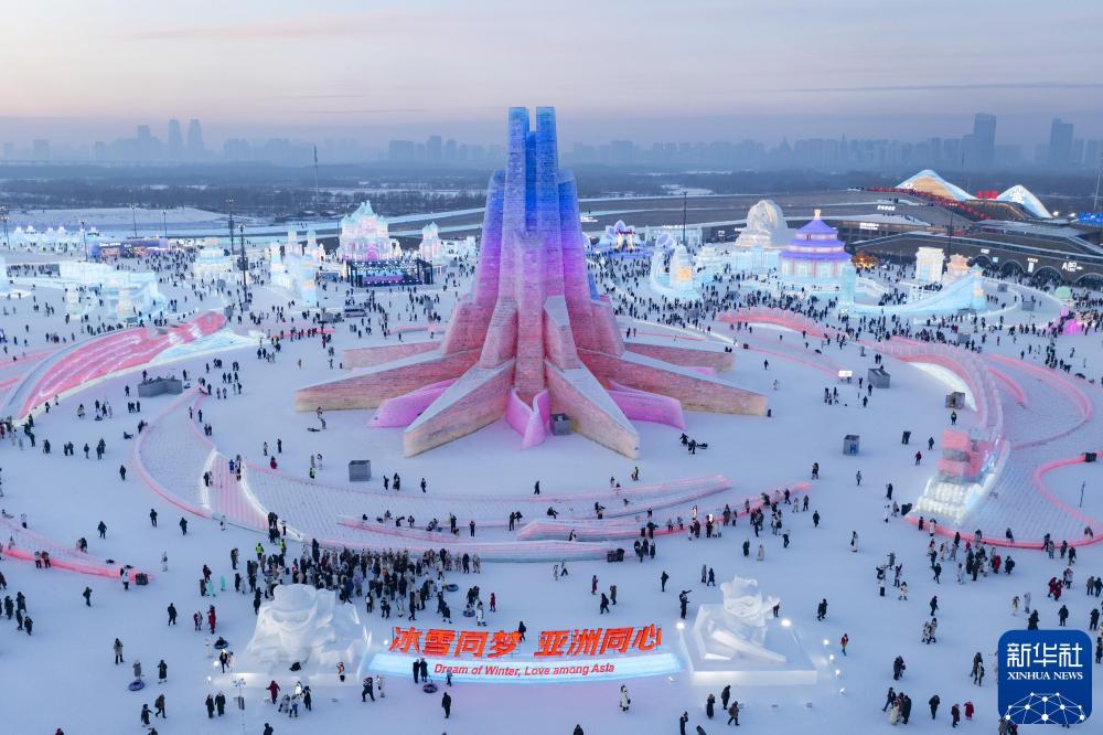 2025年1月5日,在哈爾濱冰雪大世界園區,游客在主塔“亞洲同心”附近游玩。新華社記者 謝劍飛 攝