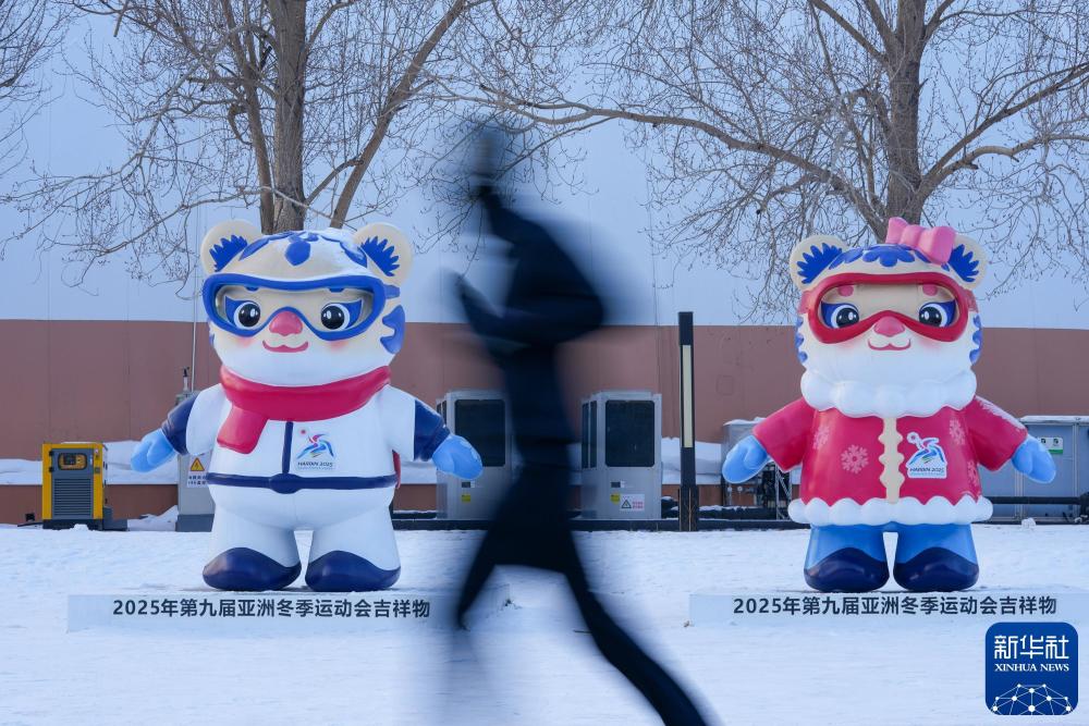 2025年1月8日,在哈爾濱湘江公園,跑步的市民從亞冬會吉祥物雕塑前經過。新華社記者 王建威 攝