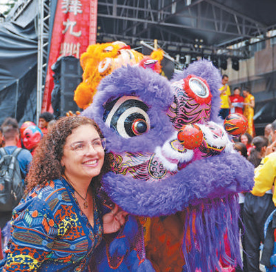 當(dāng)?shù)貢r(shí)間2月1日,在巴西圣保羅市中心自由廣場(chǎng)舉辦的歡樂(lè)春節(jié)園游會(huì)開幕式上,當(dāng)?shù)孛癖娕c舞獅表演者合影。記者 時(shí)元皓攝