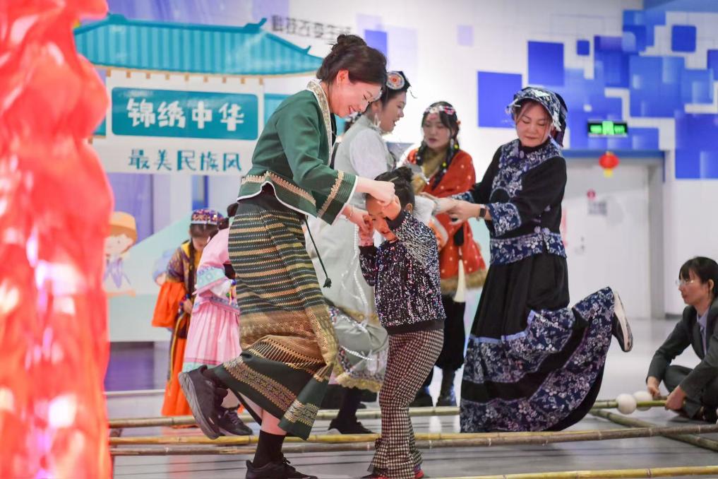 科技輔導員們身著少數民族服飾,帶領觀眾跳竹竿舞。(寧夏科技館供圖)