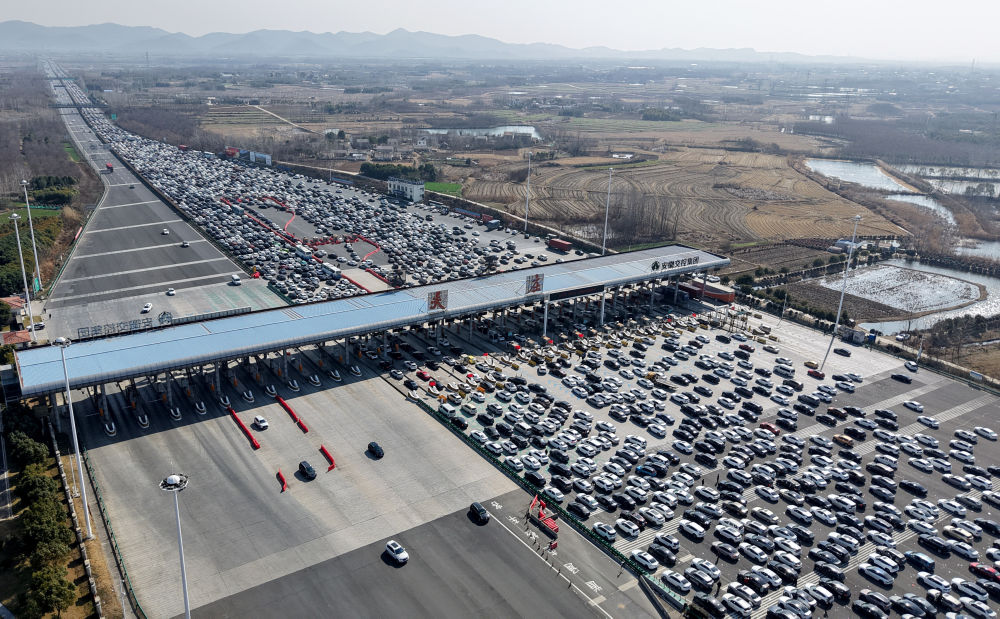 2025年2月4日,節后返程車輛通過合寧高速公路吳莊收費站(無人機照片)。新華社發(沈果 攝)