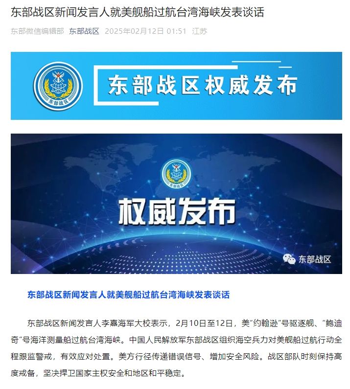 東部戰區新聞發言人李熹海軍大校表示,2月10日至12日,美“約翰遜”號驅逐艦、“鮑迪奇”號海洋測量船過航臺灣海峽。中國人民解放軍東部戰區組織海空兵力對美艦船過航行動全程跟監警戒,有效應對處置。美方行徑傳遞錯誤信號、增加安全風險。戰區部隊時刻保持高度戒備,堅決捍衛國家主權安全和地區和平穩定。