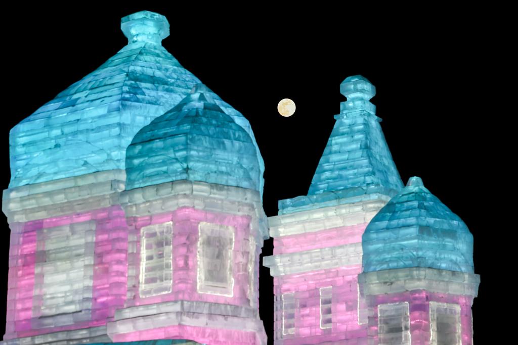 ↑在哈爾濱冰雪大世界拍攝的圓月和亞冬會(huì)主火炬。新華社記者 黃偉 攝