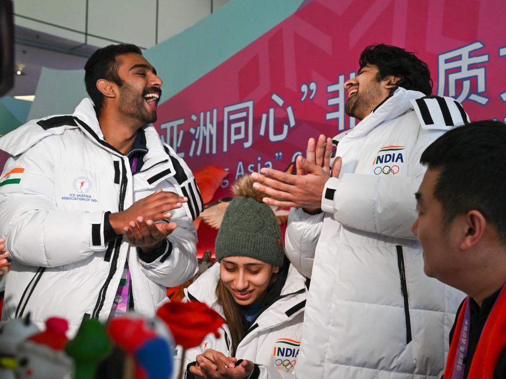 ↑印度代表團(tuán)速度滑冰運(yùn)動(dòng)員在體驗(yàn)面塑制作。新華社記者 王曦 攝