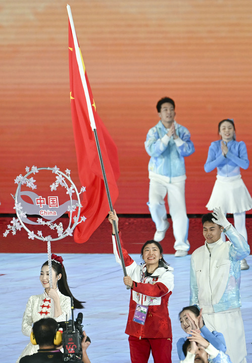 自由式滑雪運動員徐夢桃擔任中國代表團的旗手。35歲的她,是中國雪上項目的傳奇人物,實現了冬奧會、世錦賽、世界杯等多項大賽的大滿貫,成為中國雪上項目首位實現“全滿貫”的運動員。在本屆亞冬會上,她以 90.94 分的成績奪得女子空中技巧金牌,還帶領團隊在多個項目中斬獲佳績。她堅韌不拔的精神和卓越的競技表現,正是中國冰雪運動員的代表。