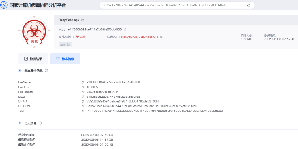 近日,國家計算機病毒應急處理中心和計算機病毒防治技術國家工程實驗室依托國家計算機病毒協同分析平臺(virus.cverc.org.cn)在我國境內捕獲發現針對我國用戶的仿冒我國國產人工智能大模型“DeepSeek”官方APP的安卓平臺手機木馬病毒,如圖1、圖2所示。