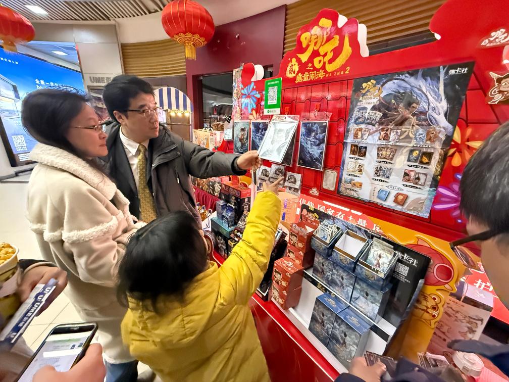 2月14日晚,在北京市海淀區的UME國際影城(華星店),家長帶著孩子挑選電影紀念品。新華社記者 才揚 攝