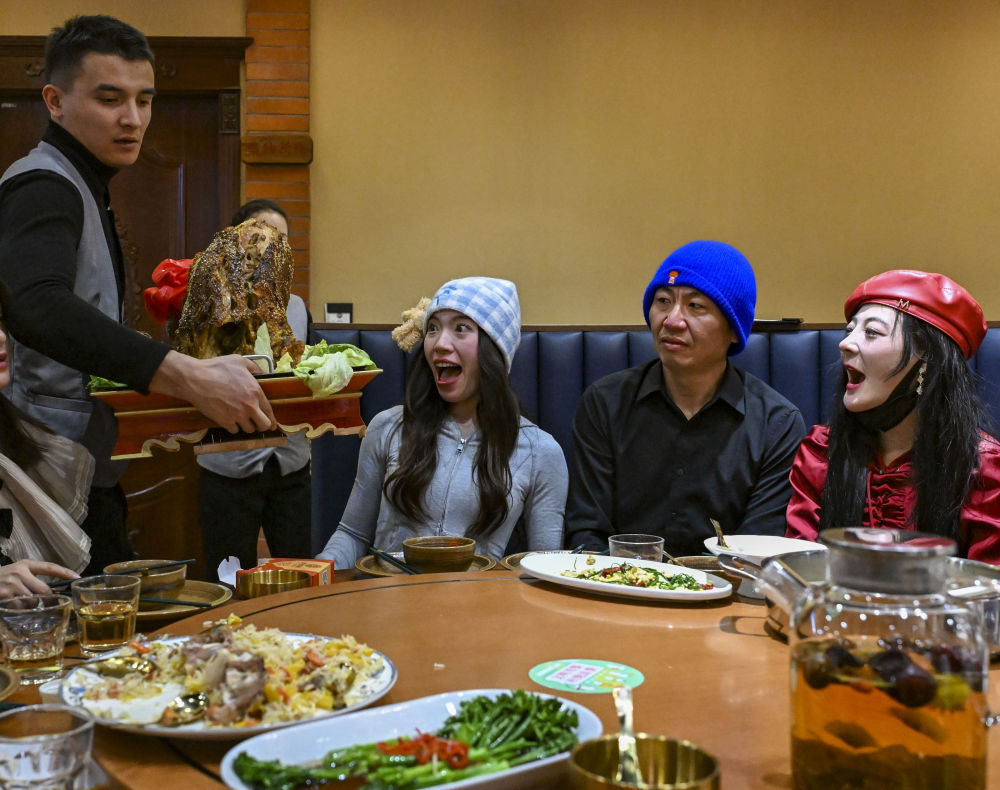 1月28日,雪友們在阿勒泰市區一家餐廳吃年夜飯。新華社記者 陳朔 攝