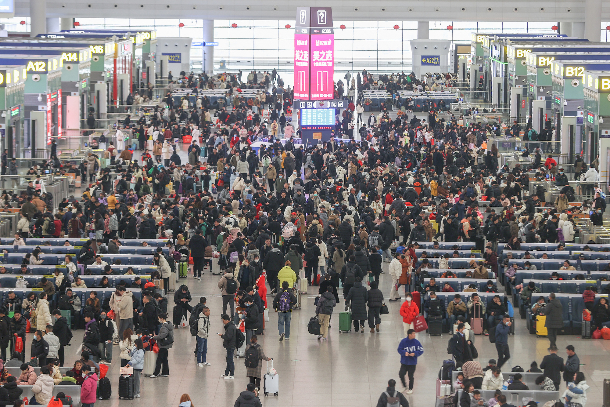 江西南昌西站,旅客在候車大廳內等候乘車