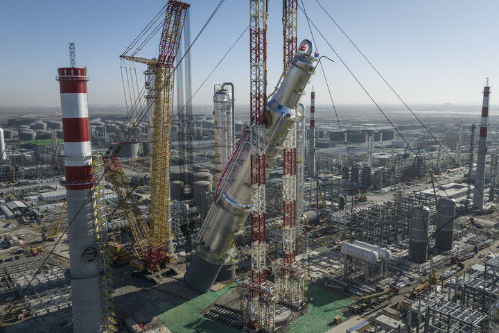 2月26日拍攝的華錦阿美精細化工及原料工程項目芳烴聯合裝置抽余液塔吊裝施工現場(無人機照片)。 新華社記者 潘昱龍 攝