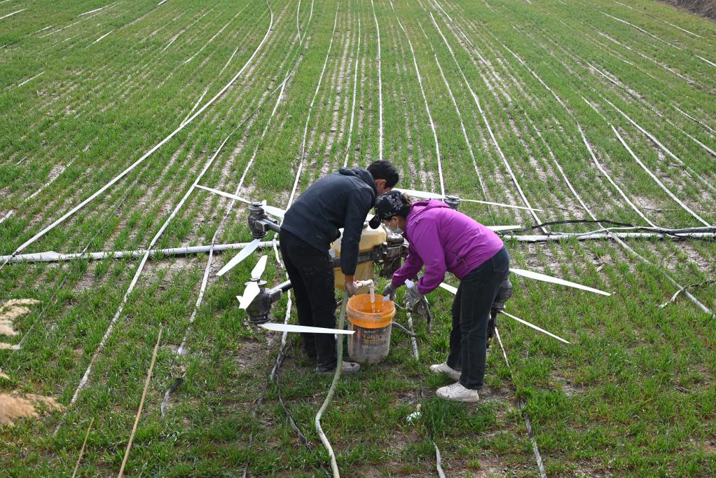 3月18日,在新疆喀什地區英吉沙縣一麥田,努日曼古麗和丈夫在為無人機添加農藥。新華社記者 尹茹紅 攝