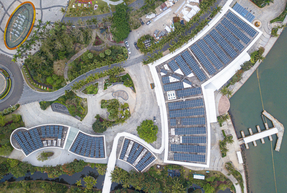 這是在博鰲零碳示范區拍攝的博鰲亞洲論壇新聞中心及配樓屋頂的光伏設備(無人機照片,3月16日攝)。