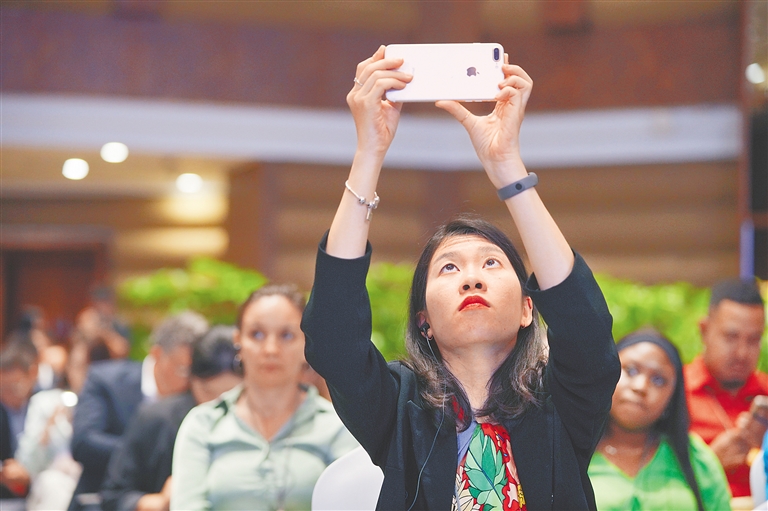 在全球自由貿易港發展論壇現場,與會嘉賓用手機記錄。海南日報全媒體記者 王程龍 攝