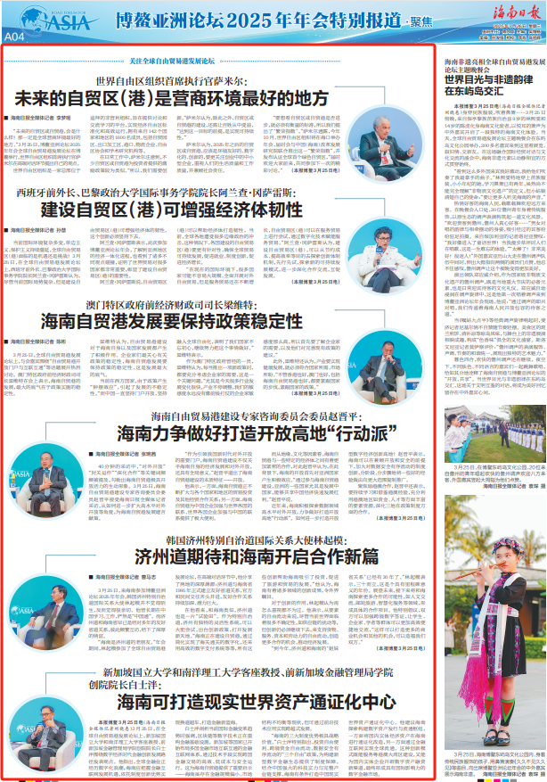 2025年是海南自貿港封關運作、擴大開放之年。當天,與會嘉賓圍繞“自由貿易港賦能全球經貿合作”“自由貿易港引領全球自由貿易進程”“自由貿易港開放門戶與互聯互通”等議題進行深入交流探討,共同描繪自貿港發展新藍圖,為海南自貿港建設貢獻“博鰲智慧”。