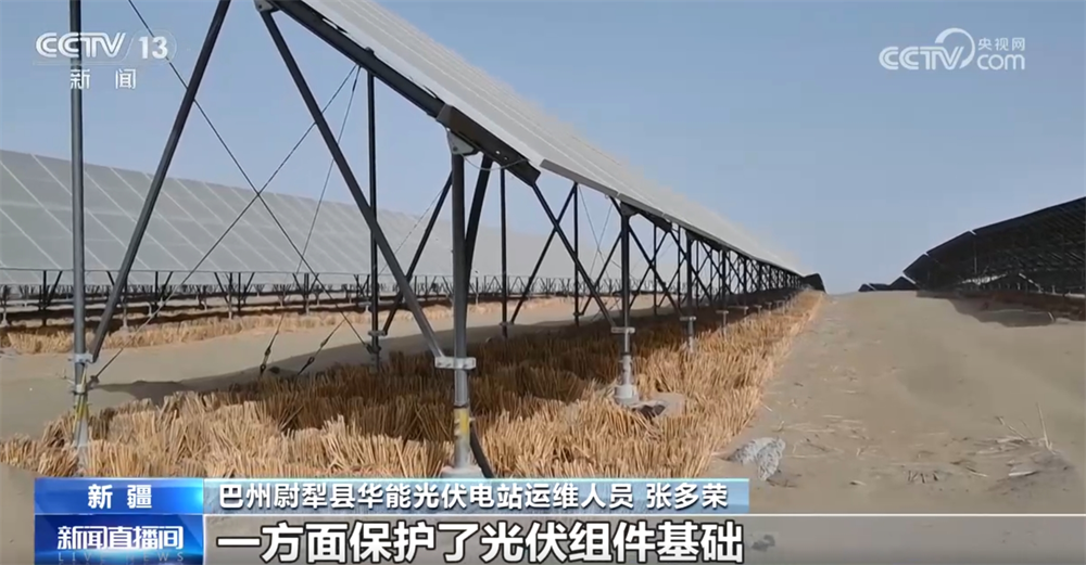 巴州尉犁縣華能光伏電站運維人員張多榮稱:“大概兩個月時間就能抽穗發芽了,一方面保護了光伏組件基礎不被黃沙掩埋或掏空,另一方面改善了周圍環境。”
