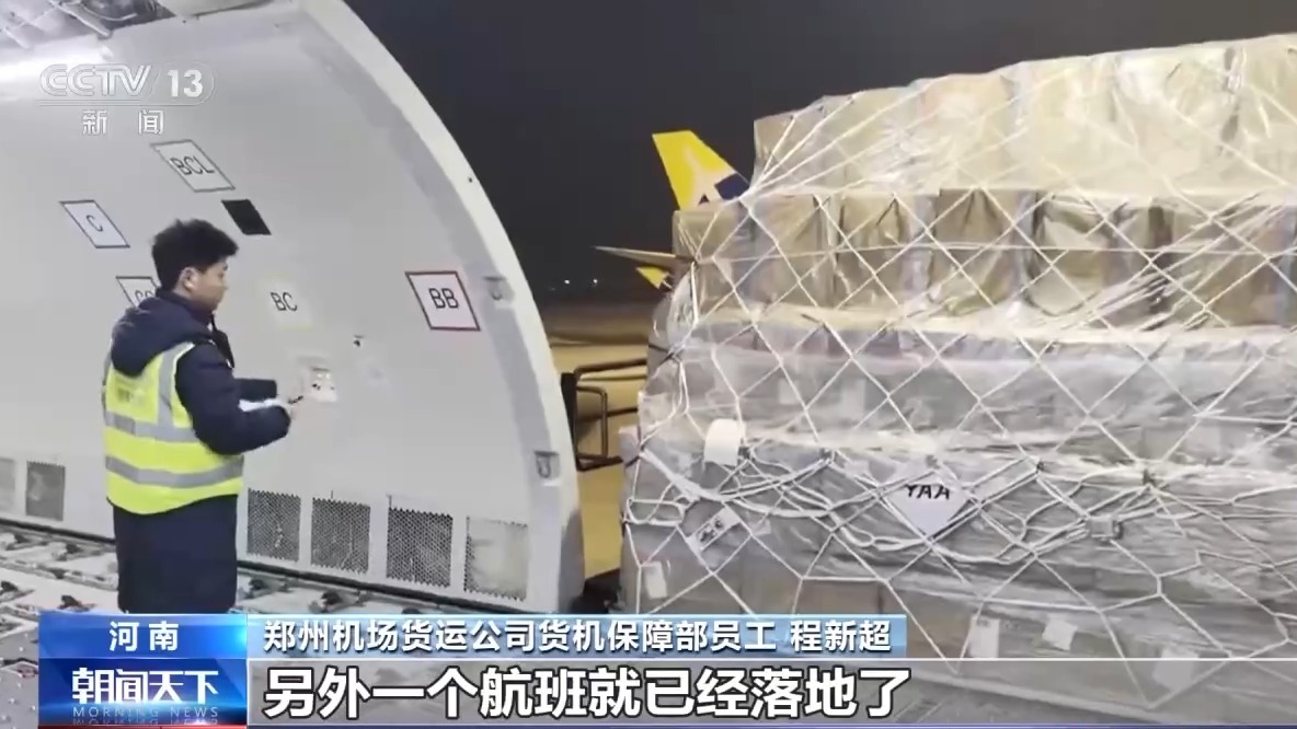 新朋友入駐,老朋友的業務也在拓展。記者采訪期間,一架從韓國飛來的全貨機剛剛落地,工作人員告訴記者,這架全貨機是通過“空空中轉”將電子產品等貨物從韓國首爾運抵鄭州,隨后再轉運至印度金奈。