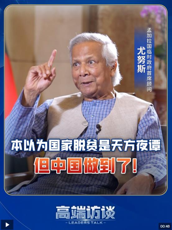 近日,到訪中國(guó)的孟加拉國(guó)臨時(shí)政府首席顧問尤努斯接受了《高端訪談》的專訪。對(duì)于中國(guó)的脫貧成就,他贊嘆不已。