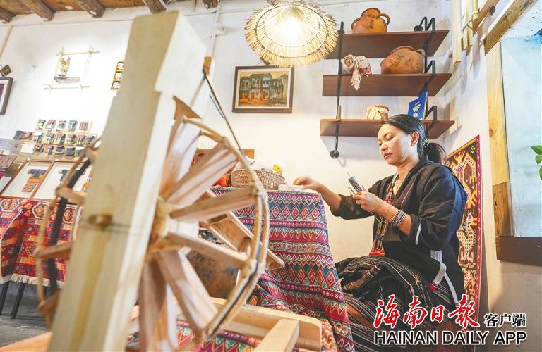 東方市八所鎮(zhèn)北黎村,村民在店內(nèi)織錦。海南日報全媒體記者陳元才 攝