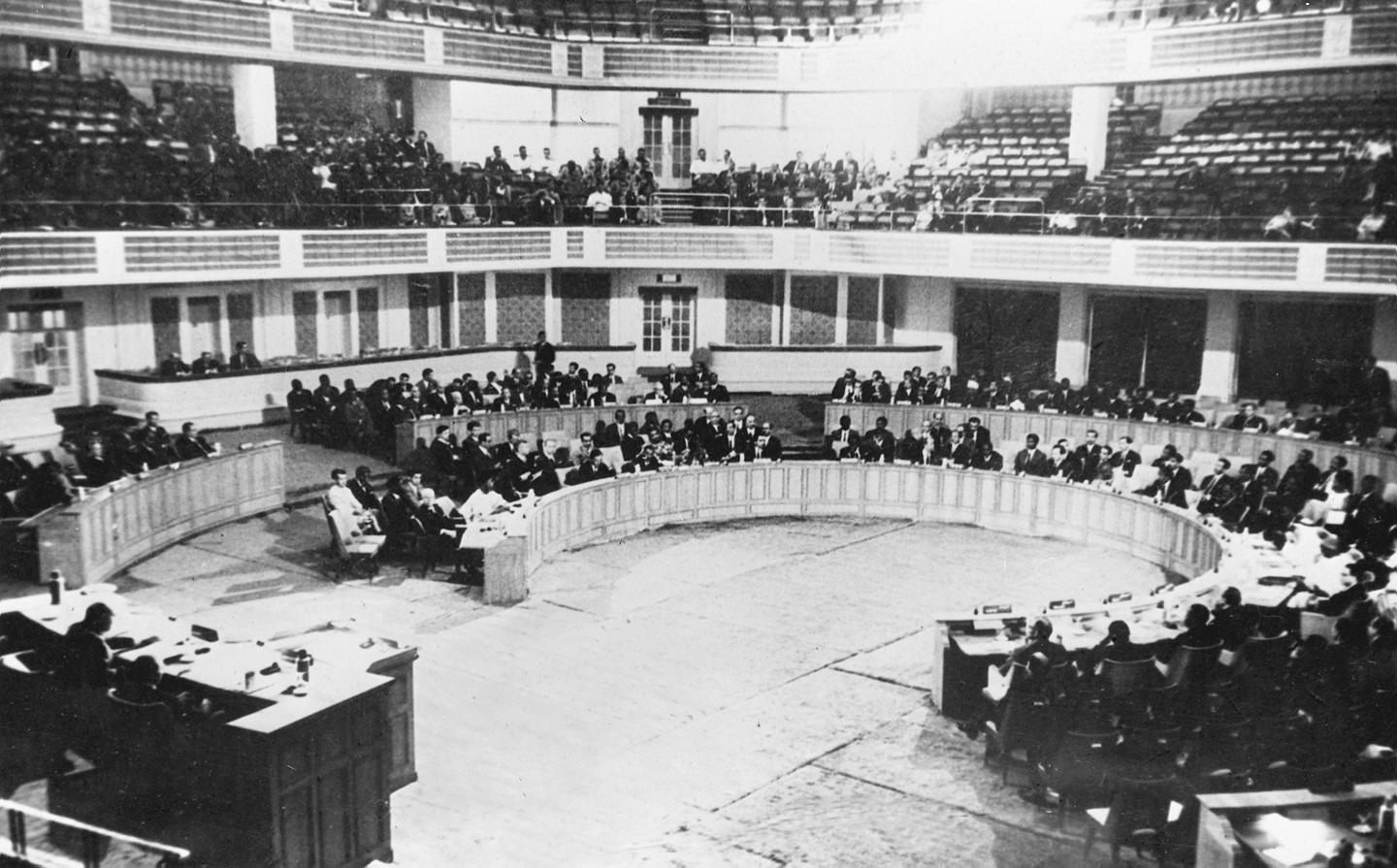 1955年4月18日至24日,29個亞非國家和地區的政府代表團在印度尼西亞萬隆召開亞非會議。圖為萬隆亞非會議會場內景。新華社記者錢嗣杰攝