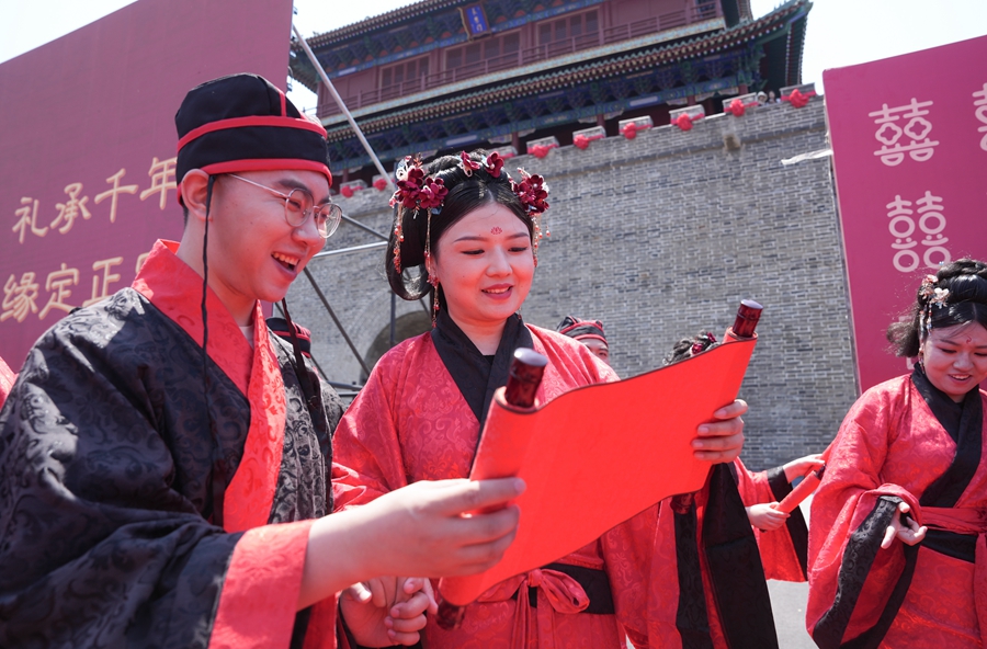 2025年5月17日,在河北省石家莊市正定古城舉行的集體婚禮上,一對新人在閱讀婚書。新華社發(梁子棟攝)