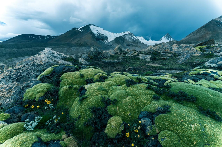 第二天一早,我們繼續(xù)向山脈的腹地去探索,前往冷布崗日腹地的道路也是無人踏足的,沒有正規(guī)車道的,所以我們同樣只能沿著牧民留下的車轍印前行。在一望無際的高原上,我們找不到路的時候就操縱無人機升空去探索路線。經(jīng)過了一整天的艱難探索,終于抵達了目的地,這個地方再往上走是完全沒有路了。在海拔約5800米左右的這個地方,不僅有巍峨壯美的雪山,還長著很多這種獨特的高山苔蘚,這種植被通常只分布在海拔4000米以上的地區(qū),極具地域特色。所以在拍攝時,我將這些高原特有的植被作為前景,既展現(xiàn)了高原生態(tài)風(fēng)貌,也作為海拔高度的天然標識,然后遠處雄偉的冷布崗日雪山則構(gòu)成了畫面的核心部分。