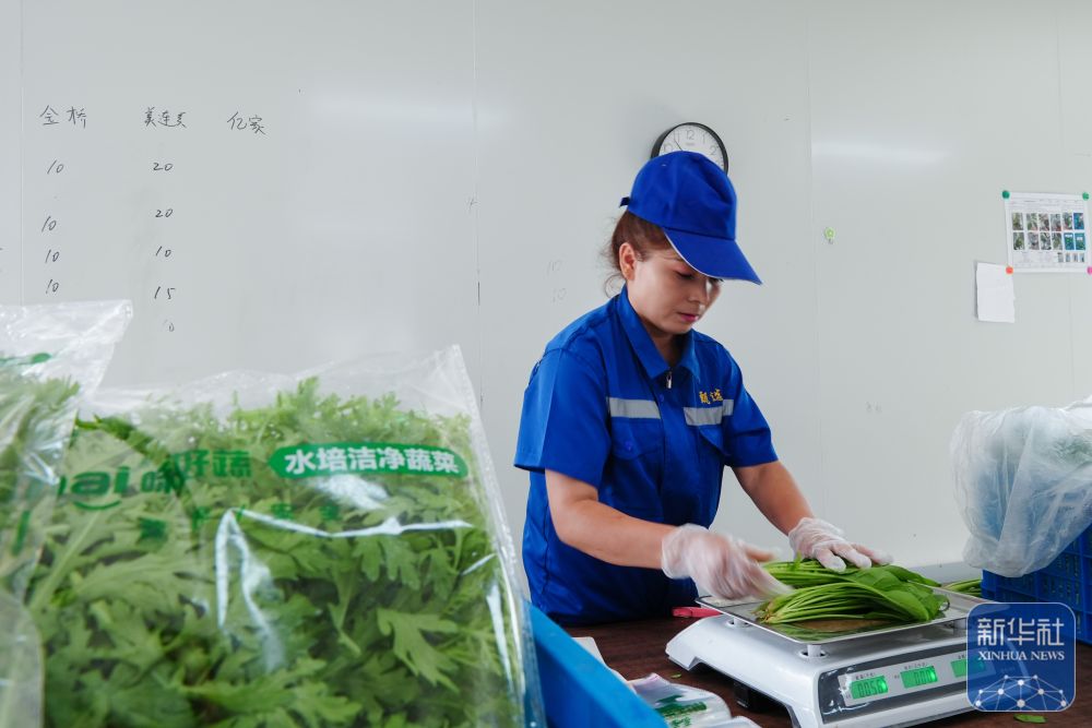 ↑ 6月25日,在新疆阿克蘇地區庫車市甬庫同心村智慧農業植物工廠,工作人員對收獲的農作物進行稱重打包。