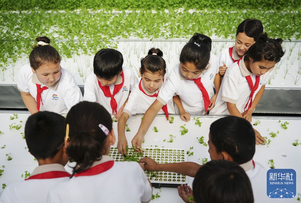 ↑ 6月25日,在新疆阿克蘇地區庫車市甬庫同心村智慧農業植物工廠,當地小學生體驗無土栽培。