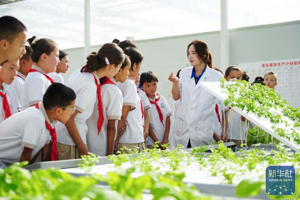 ↑ 6月25日,在新疆阿克蘇地區庫車市甬庫同心村智慧農業植物工廠,工作人員為當地小學生講解無土栽培技術。