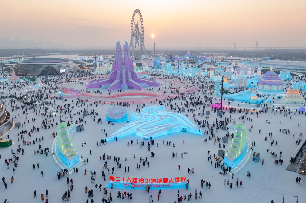 游客在哈爾濱冰雪大世界園區內游玩(無人機照片)。新華社記者謝劍飛 攝
