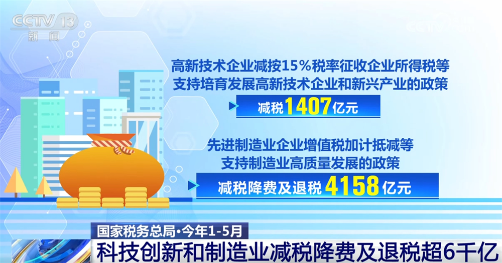 數(shù)據(jù)顯示,今年1—5月,現(xiàn)行支持科技創(chuàng)新和制造業(yè)發(fā)展的主要政策減稅降費(fèi)及退稅達(dá)6361億元。其中,高新技術(shù)企業(yè)減按15%稅率征收企業(yè)所得稅等支持培育發(fā)展高新技術(shù)企業(yè)和新興產(chǎn)業(yè)的政策減稅1407億元;先進(jìn)制造業(yè)企業(yè)增值稅加計(jì)抵減等支持制造業(yè)高質(zhì)量發(fā)展的政策減稅降費(fèi)及退稅4158億元。