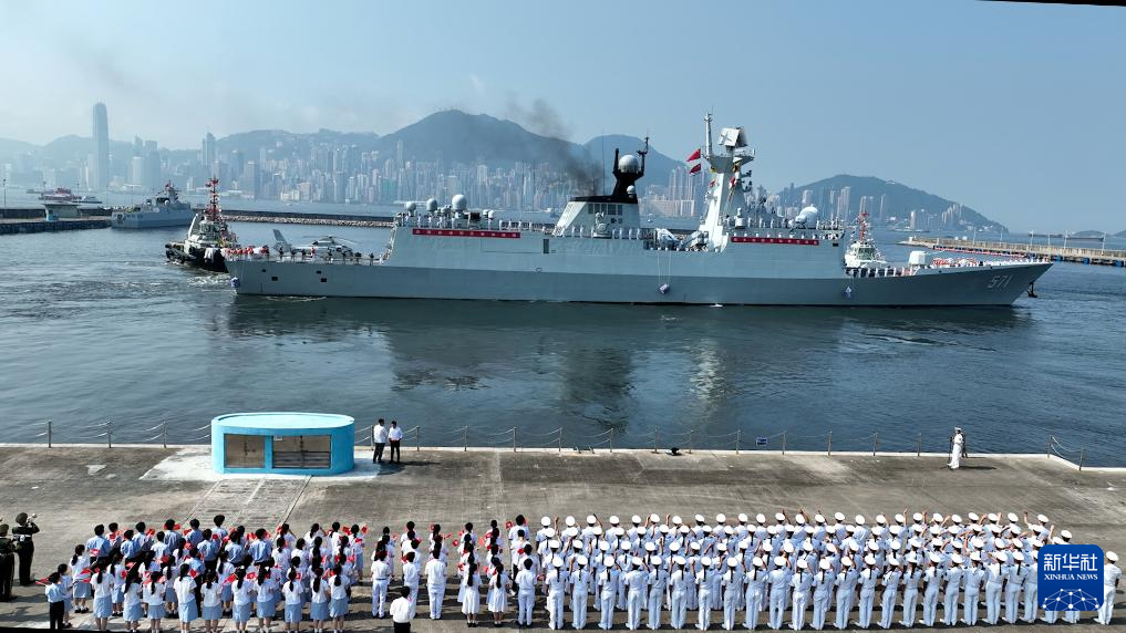 7月7日,湛江艦駛離昂船洲軍營碼頭,士兵分區列隊向前來送行的人群揮手告別。新華社發(馮麗 攝)