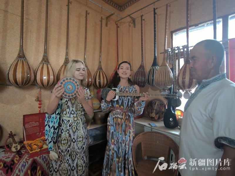 7月28日,在新和縣依其艾日克鎮加依村,俄羅斯籍網絡達人梅麗莎(左)和網絡名人古麗皮亞·買買提依明(中)正在體驗民間手工樂器。石榴云/新疆日報記者 甘興華攝