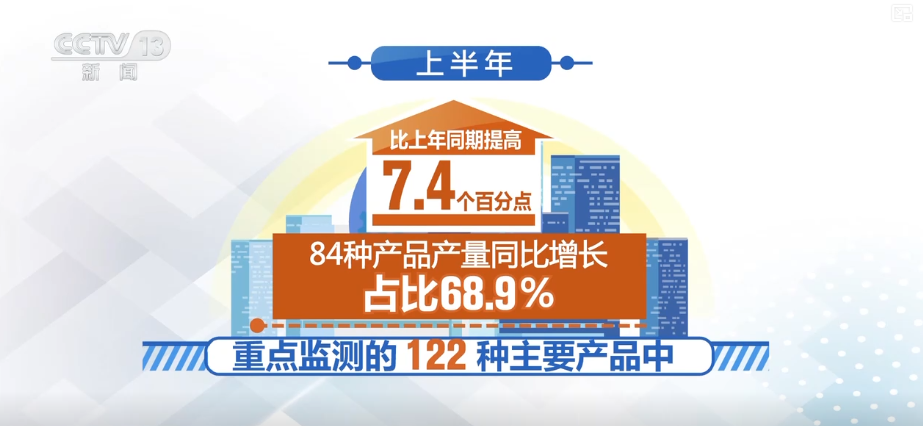 上半年,重點監測的122種主要產品中,84種產品產量同比增長,占比68.9%,比上年同期提高7.4個百分點。