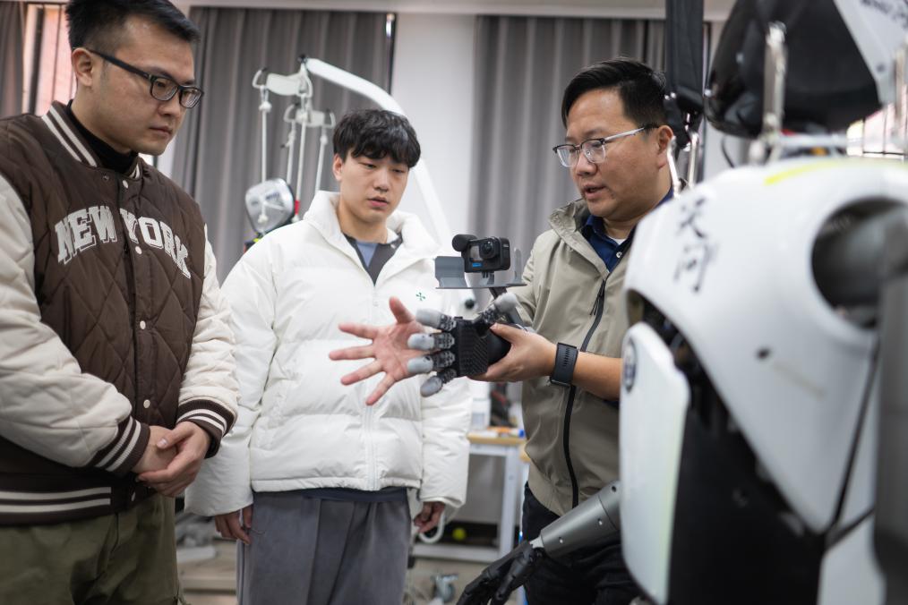 武漢大學研發團隊在對“天問”人形機器人進行調試。新華社記者肖藝九 攝