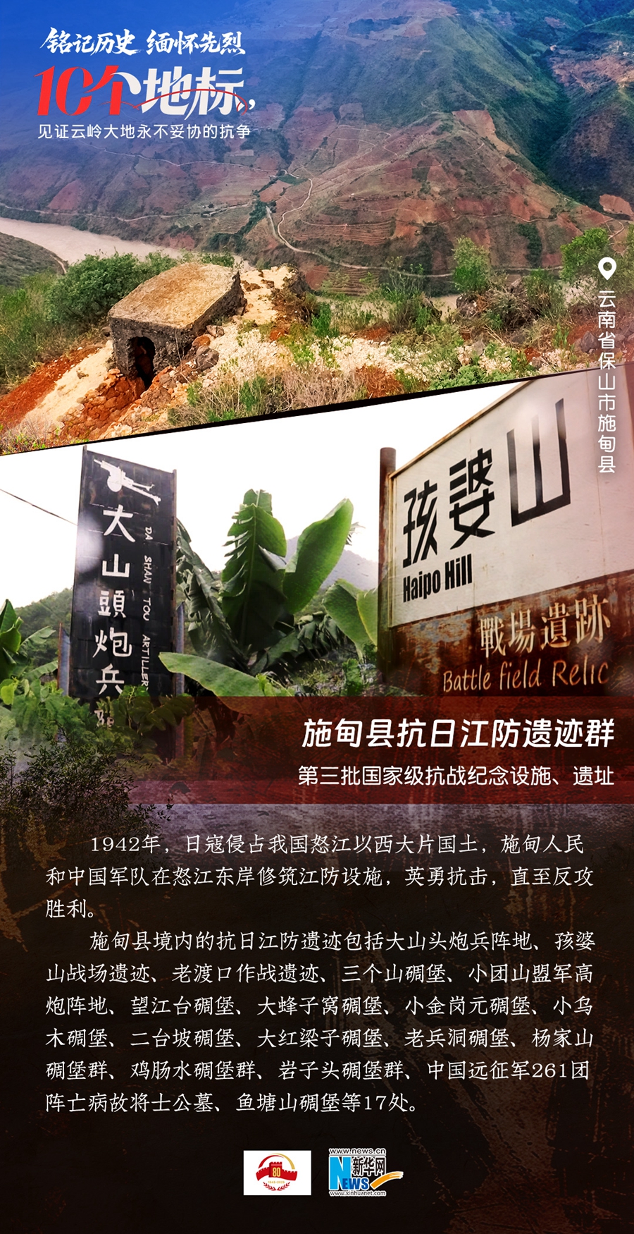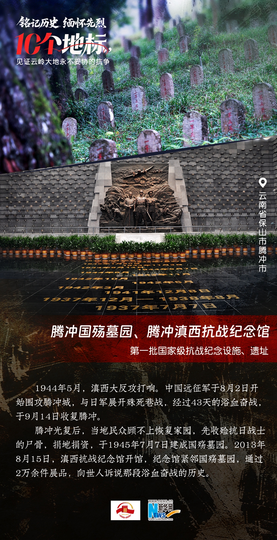 ??80年過去,曾經的戰場硝煙雖散,但英氣永存。在國務院公布的前三批國家級抗戰紀念設施、遺址名錄中,云南省共有10個,分別為騰沖國殤墓園、騰沖滇西抗戰紀念館,龍陵抗日戰爭紀念館,國立西南聯合大學舊址,抗戰勝利紀念堂,松山戰役舊址,南洋華僑機工回國抗日紀念碑,怒江駝峰航線紀念館,施甸縣抗日江防遺跡群,滇緬公路惠通橋,滇西抗日戰爭紀念碑。它們承載著國人共同的歷史記憶與民族情感,也為我們學習和傳承抗戰精神提供了現實條件。