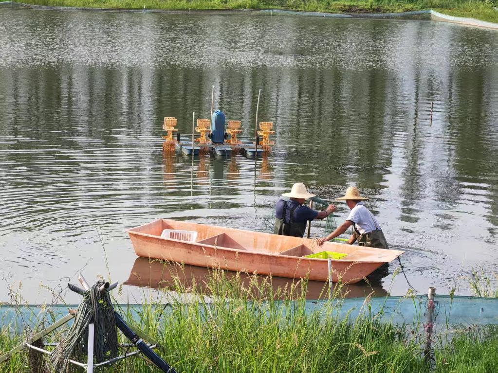 8月28日,在湖北省潛江市后湖管理區張家窯辦事處的一處池塘里,養殖戶在捕撈小龍蝦。新華社記者 樂文婉 攝