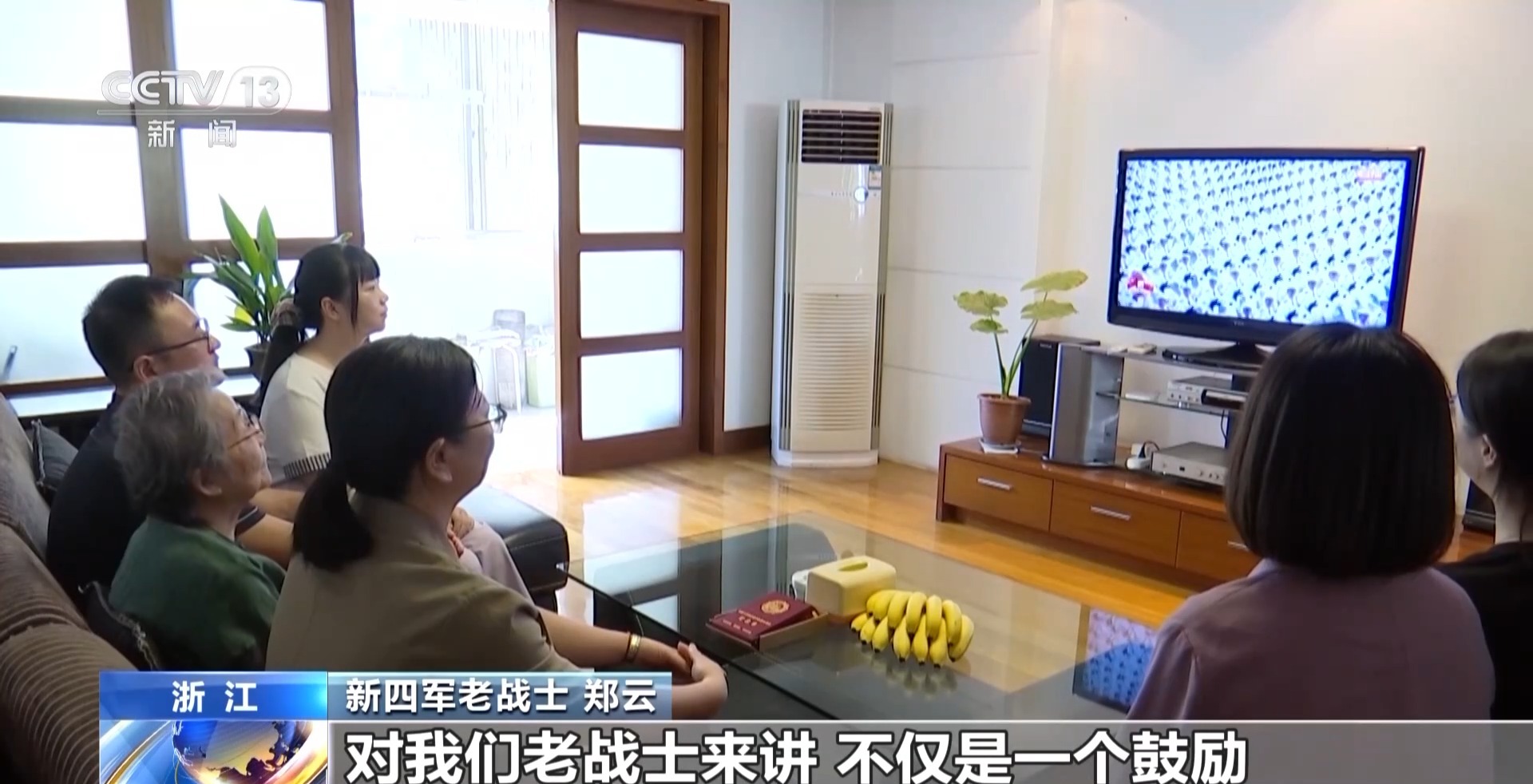 在浙江湖州93歲新四軍老戰士鄭云的家中,社區工作人員與鄭云老人一起收看大會直播,鄭云曾先后參加過抗日戰爭、解放戰爭,看完此次閱兵,她感觸頗深。