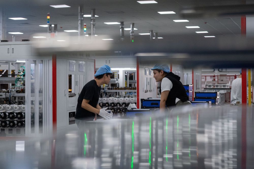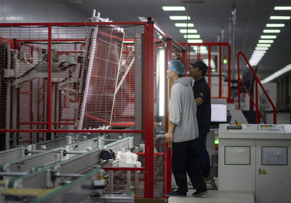 9月22日,工人在新疆巴音郭楞蒙古自治州若羌縣的國晟企誠新能源有限公司生產光伏電池片。