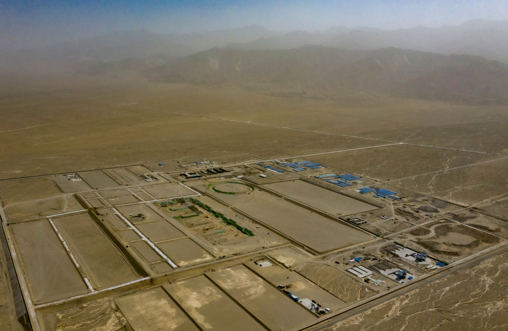 9月22日在新疆巴音郭楞蒙古自治州若羌縣拍攝的中國綠發新疆中綠電若羌400萬千瓦光伏項目(無人機照片)。該項目每年可發電69.08億千瓦時,滿足南疆200萬戶家庭用電需求,減排208.24萬噸煤耗。