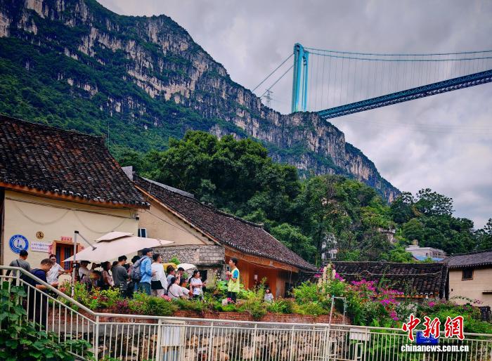 在花江村,記者看到不少游客悠閑地坐在青瓦灰墻的布依族傳統民居前品茶觀橋,或在村口的路邊尋找最佳角度,留下“與大橋同框”的紀念照;更有游客信步走向村邊的花江鐵索橋,尋找角度拍攝這座曾是黔滇往來要道的古橋,與遠處現代工程的杰作形成“新老同框”的獨特畫面。