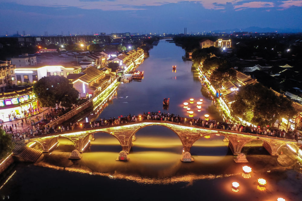 10月2日,游客在塘棲古鎮的廣濟橋觀賞運河夜景(無人機照片)。 新華社記者 徐昱 攝