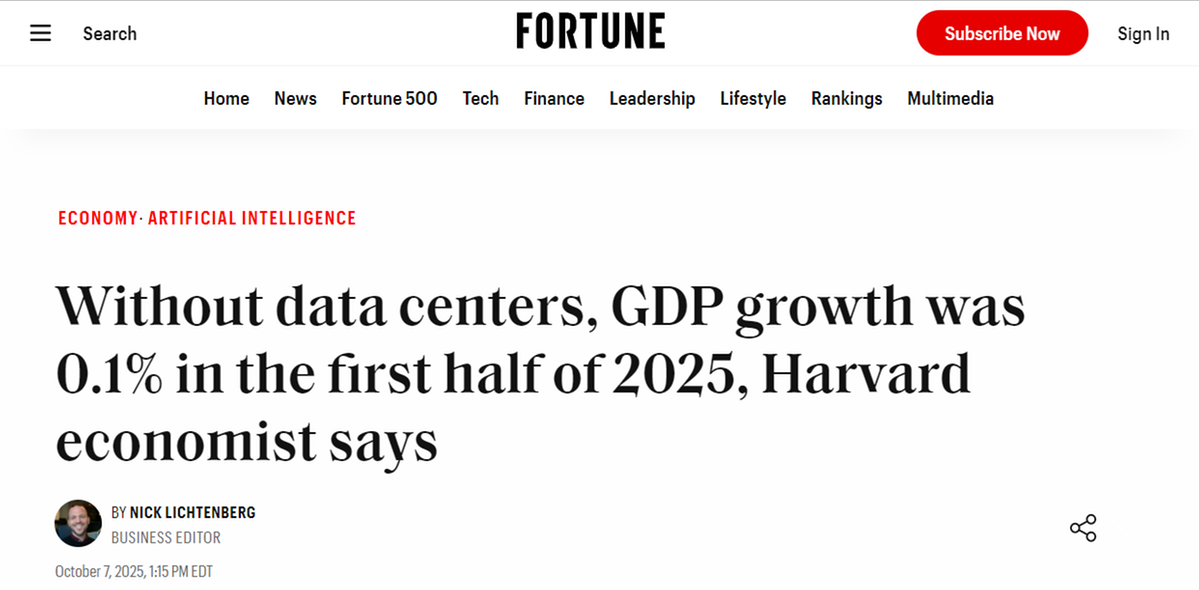 2025年上半年,美國GDP增長幾乎全部依賴數據中心和AI投資,其中AI投資占比近92%。哈佛大學經濟學家杰森·弗曼指出,若剔除這一領域,其余產業合計成長率僅0.1%,幾乎陷入停滯。