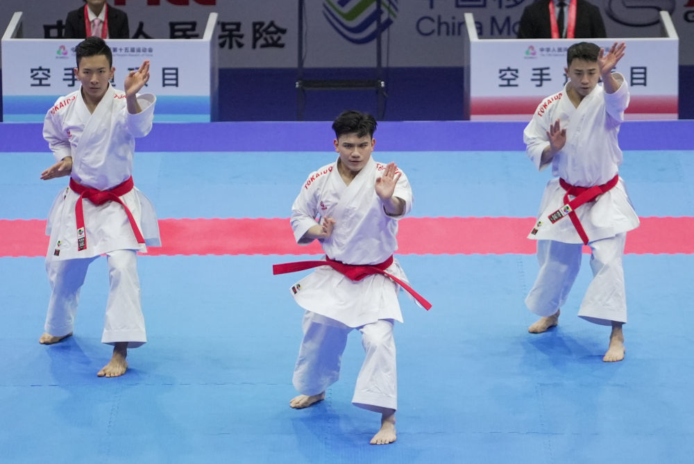 2025年11月6日,澳門代表隊在澳門舉行的第十五屆全國運動會群眾比賽項目空手道男子業余組團體型半決賽中。新華社發