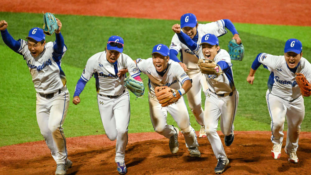 2025年11月19日,廣東隊球員在廣東中山舉行的第十五屆全國運動會棒球1-4名交叉賽后慶祝勝利。新華社記者 丁磊 攝