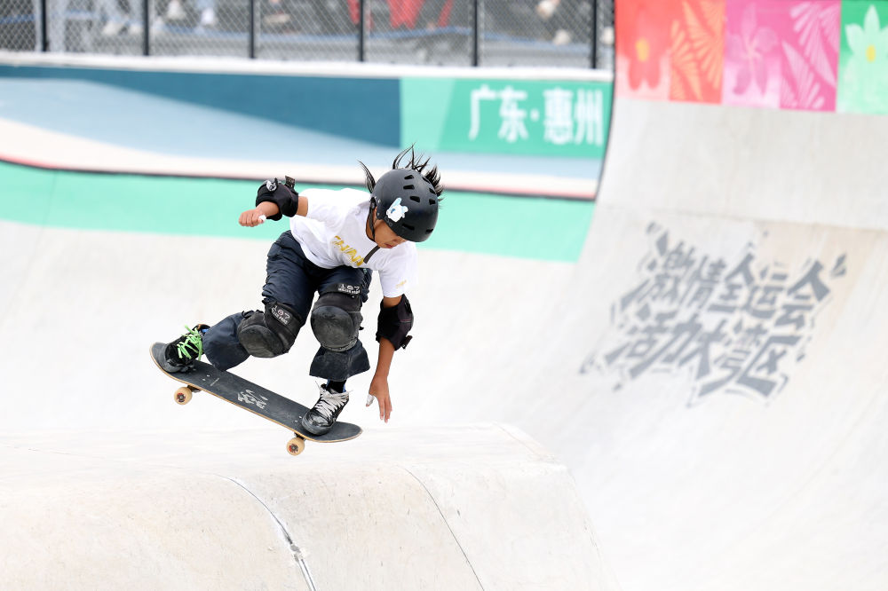 2025年11月11日,廣東隊選手鄒明珂在廣東惠州舉行的第十五屆全國運動會滑板項目女子碗池賽決賽中。新華社記者盧漢欣攝