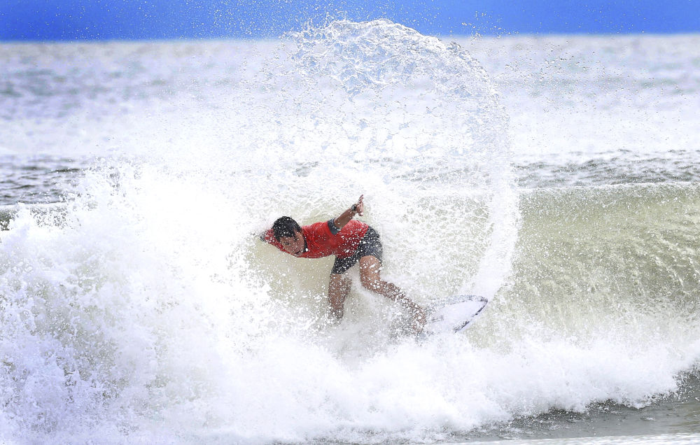 2025年11月13日,福建隊選手陳丙寅在廣東汕頭舉行的第十五屆全國運動會沖浪男子短板第一輪比賽中。新華社記者盧漢欣攝