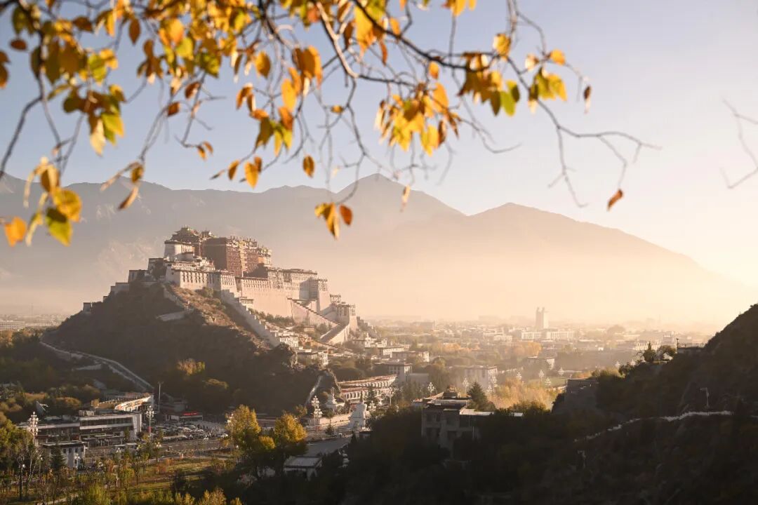 2025年10月22日清晨,薄霧尚未散盡,西藏拉薩團結公園的黃葉與布達拉宮相映成趣,勾勒出高原秋日的獨特畫卷。中新社記者 貢嘎來松 攝